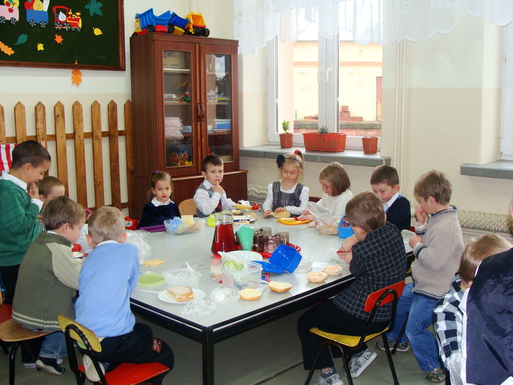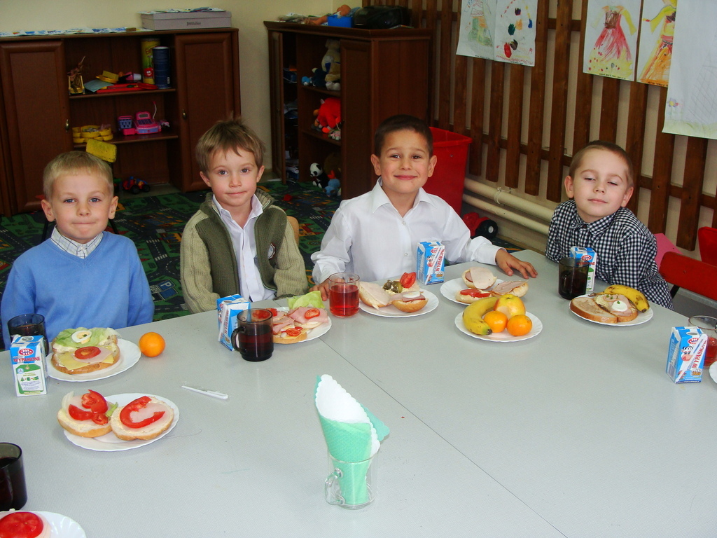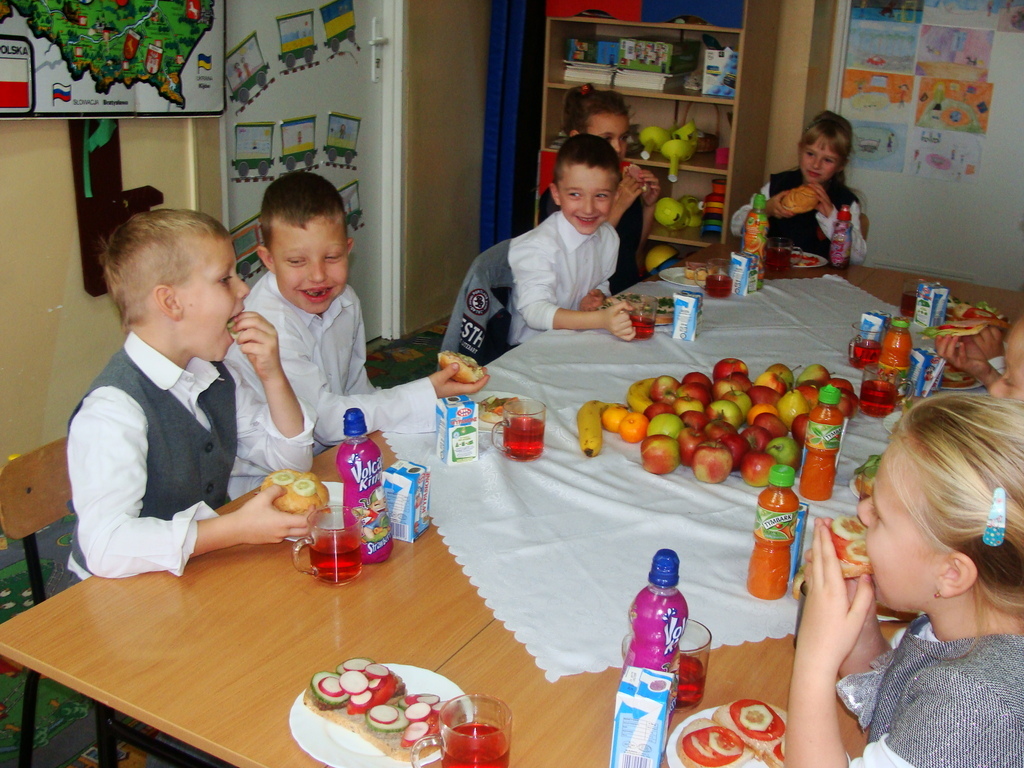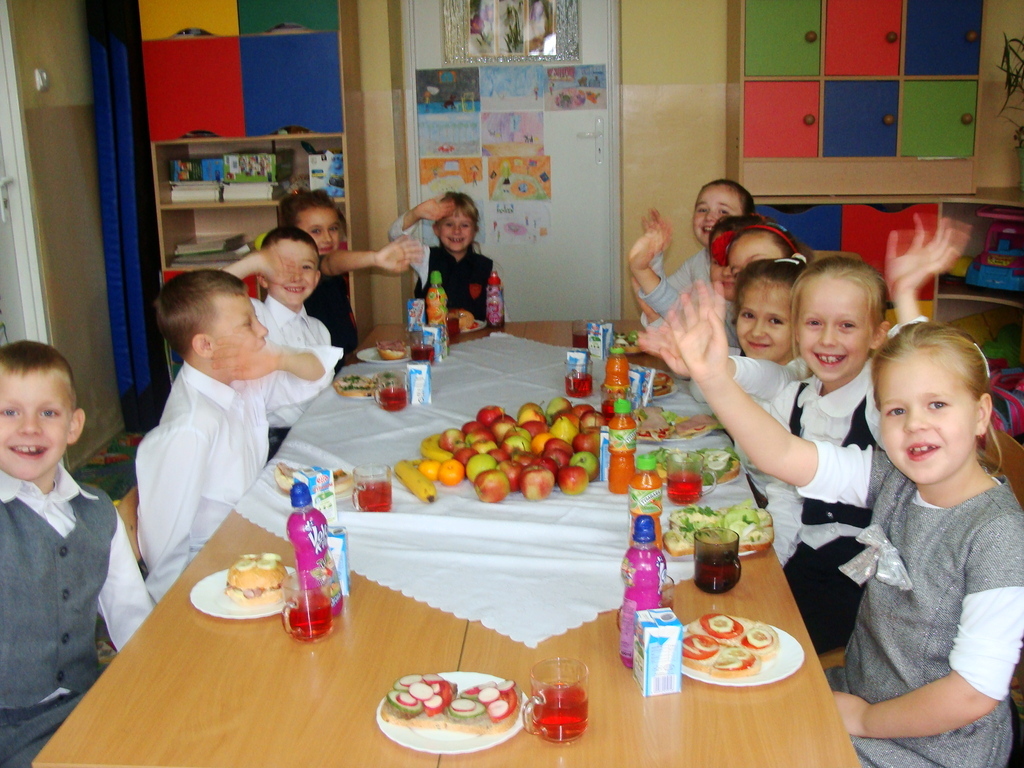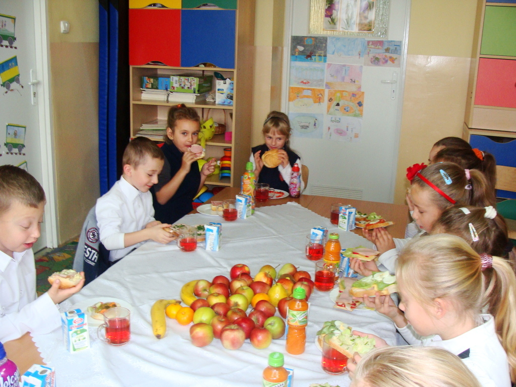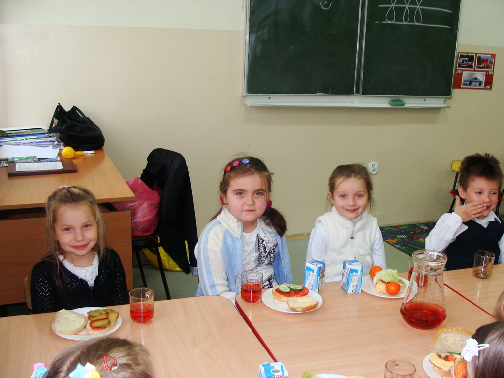 Podczas przygotowywania posiłków dzieci ubrane były w fartuszki, uczyły się nakrywać do stołu, pamiętały również o higienie rąk. W gotowości były także niezbędne akcesoria kuchenne: ściereczki, deski, talerzyki, noże i produkty spożywcze: umyte i obrane warzywa, wędliny, sery i nabiał. Uczniowie z wielką radością i dumą przygotowywali zdrowe i pyszne kanapki, które ze smakiem zjadali.