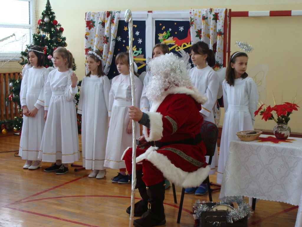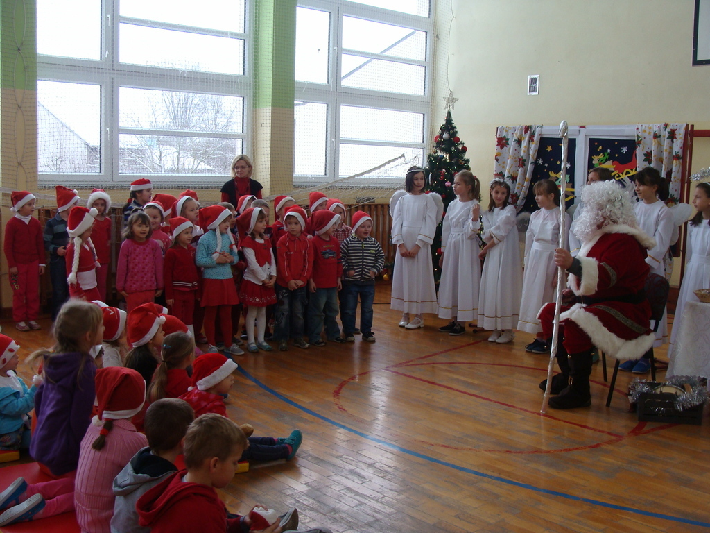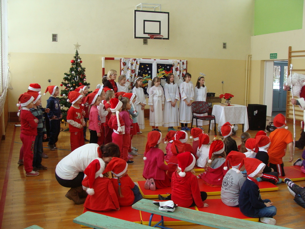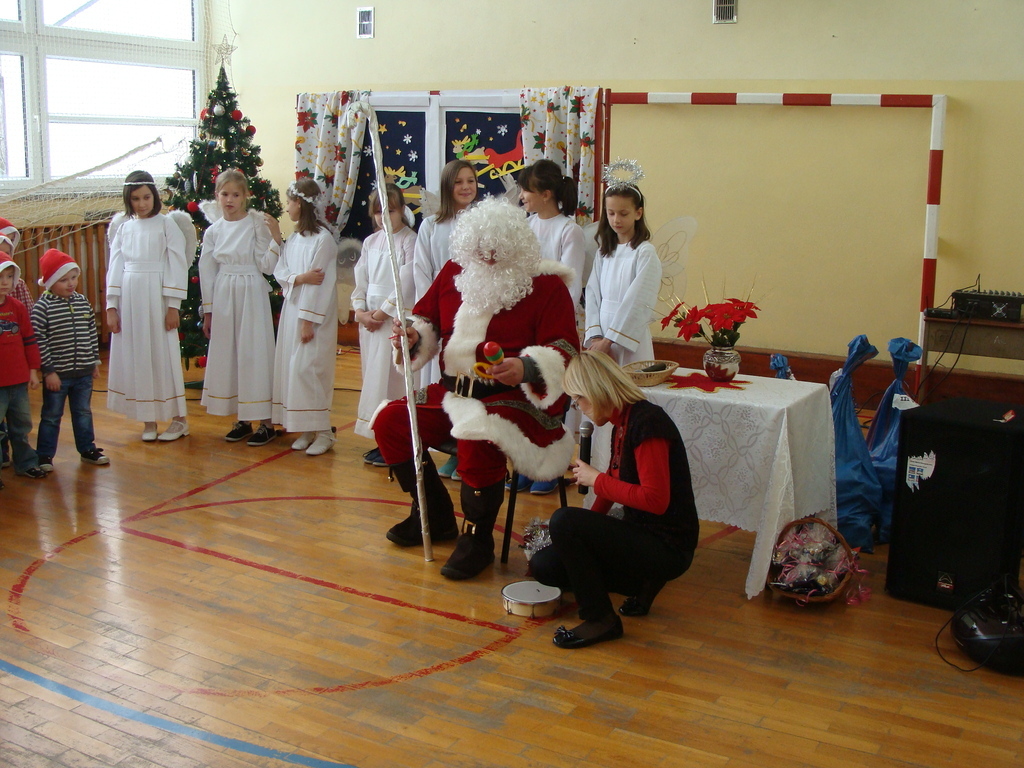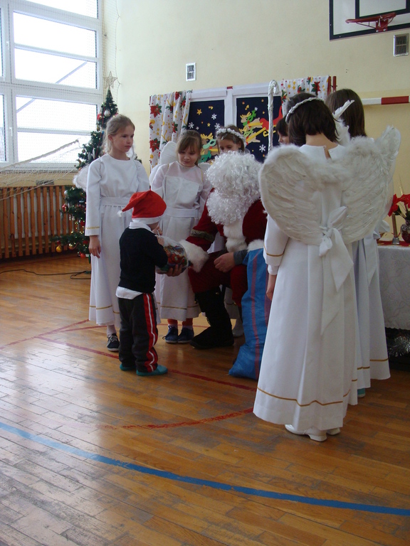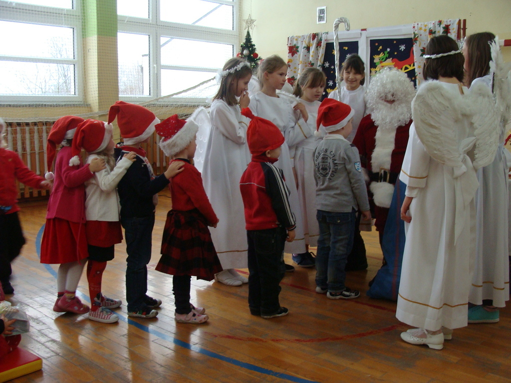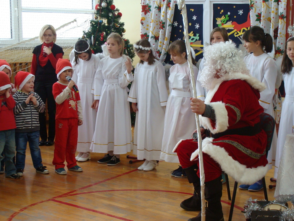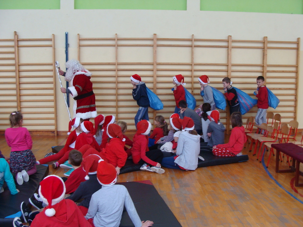 Jak co roku, również i w tym 6 grudnia odwiedził nas Święty Mikołaj. Wszyscy uczniowie wraz z nauczycielami oczekiwali na Niego na sali gimnastycznej. Wychowankowie punktu przedszkolnego oraz oddziału przedszkolnego oraz uczniowie klas I-VI ubrani w czapki mikołajkowe śpiewali piosenki dla Mikołaja. Wszystkie dzieci otrzymały wspaniałe prezenty.